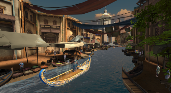 展览中,XR 技术不仅复刻了剧本里的核心场景,更将楼兰古国的繁华纳入其中。在虚拟场景里,观众随楼兰公主登上小船,顺流进入楼兰城中,看两岸商铺林立,馕、羊肉串、葡萄瓜果与瓷器、丝绸、波斯地毯等东西方商品琳琅满目,亲身感受丝路通商的盛景;当楼兰公主摊开手掌,鎏金蚕吐出金丝包裹观众,仿佛又将人从楼兰的热闹拉回时空交错的节点,为这场 “穿越” 之旅增添了更多惊喜。