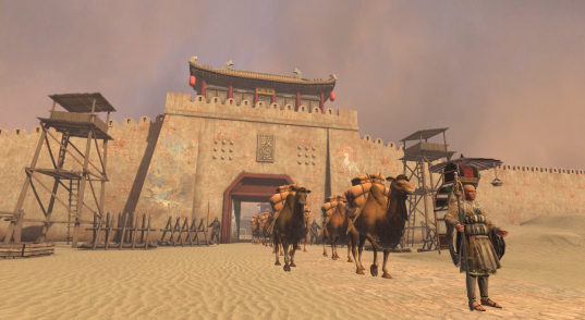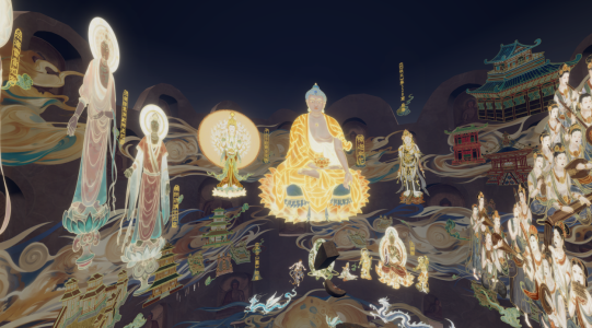 跟随 XR 场景指引,观众仿佛化身“丝路行者”,先是置身汉朝未央宫,与即将再度出使西域的张骞相遇。张骞递来的西域地图在脚下延展,山川楼台、地形地貌尽收眼底,他所赠予的马车,更载着观众依次掠过武威、张掖、酒泉、嘉峪关,看塞外山丘上的长城蜿蜒,望张骞使团队伍迎着风沙向远方行进,耳畔还能听见 “劝君更尽一杯酒,西出阳关无故人” 的悠扬咏叹。穿过嘉峪关城楼,敦煌城便在风沙后显现,风尘仆仆的玄奘迎面而来,托付佛像转交莫高窟画师的情节,让观众瞬间代入丝路之上的人文交流场景;随着画卷展开,敦煌壁画中的佛像、金刚力士、飞天女神萦绕周身,飞天女神时而簇拥观众触碰星辉,时而召唤九色鹿前来,这般沉浸式体验,完美还原了剧本中 “敦煌秘境” 的奇幻意境。