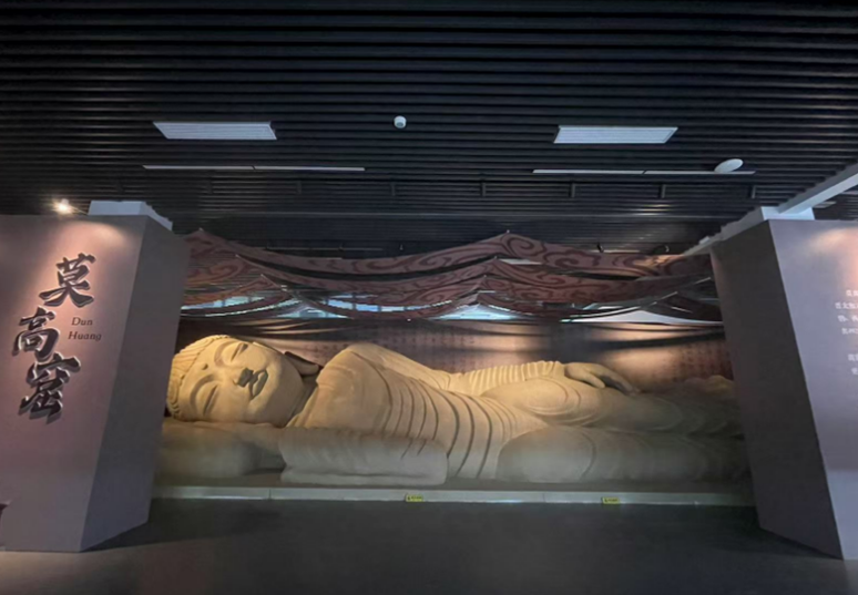 步入展馆,河西走廊的历史厚重感与江南水乡的温婉气质扑面而来。现场陈列的 7 件实物文物,每一道纹理都承载着丝路通商与人文交流的过往;15 米长的卧佛栩栩如生,复刻的莫高窟 17 窟藏经洞更是瞬间将人拉入丝路往事的记忆中。而当观众戴上 XR 设备,“丝绸之路中”的奇幻场景便即刻 “成真”——虚拟空间内,玻璃展柜中的丝路标志文物 “鎏金蚕” 昂起头颅,在画外音对其来历与丝路意义的介绍中,缓缓开启时空之门,带领观众踏上跨越汉朝至元朝的丝路征程
