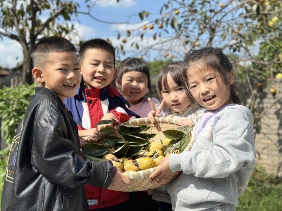 孩子们簇拥在柿子树下,眼神里满是对丰收的喜悦与好奇。他们小心翼翼地将成熟的柿子采摘下来,装满了一个个竹篮。金黄的柿子、稚嫩的笑脸与秋日的蓝天相映成趣,构成了一幅充满生机的丰收画卷。